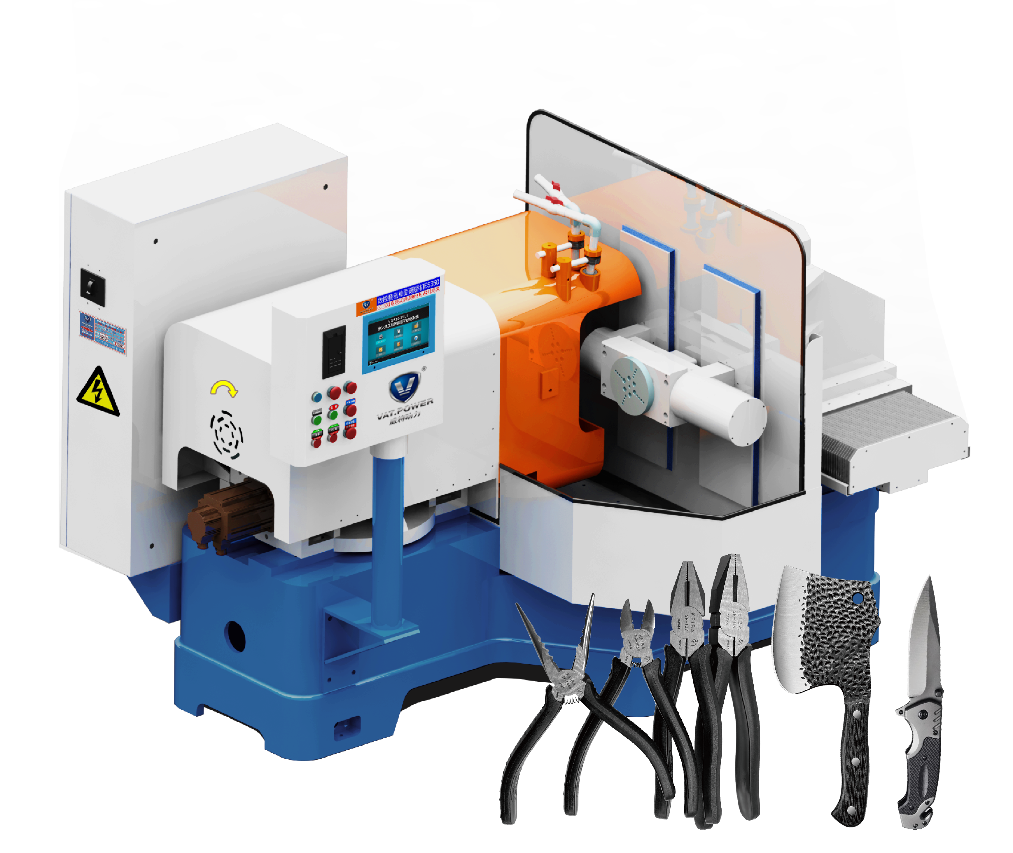 研磨剪刀、牛扒刀、花刀、航空剪、登山刀、求生刀、鐮刀、單刀、菜刀和各類(lèi)刀剪產(chǎn)品等。生產(chǎn)效率高,自動(dòng)化程度高,操作簡(jiǎn)單, 可實(shí)現(xiàn)一人多機(jī)操作,進(jìn)一步降低生產(chǎn)人工成本;磨削精度高,砂輪損耗自動(dòng)補(bǔ)償。